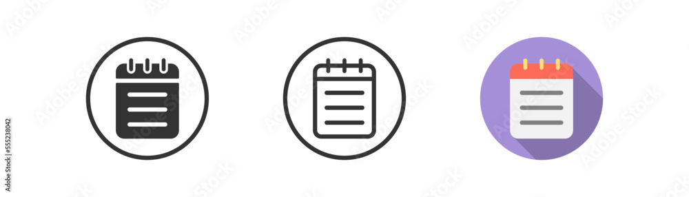 Paper notebook icon on purple background with shadow in circle. Line ...