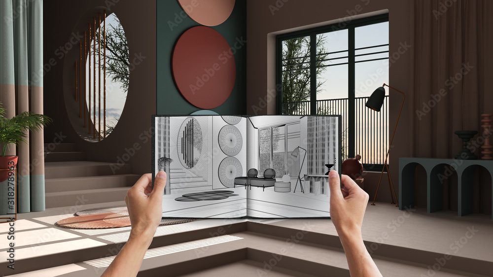 Hands holding notepad with japandi living room design blueprint sketch ...