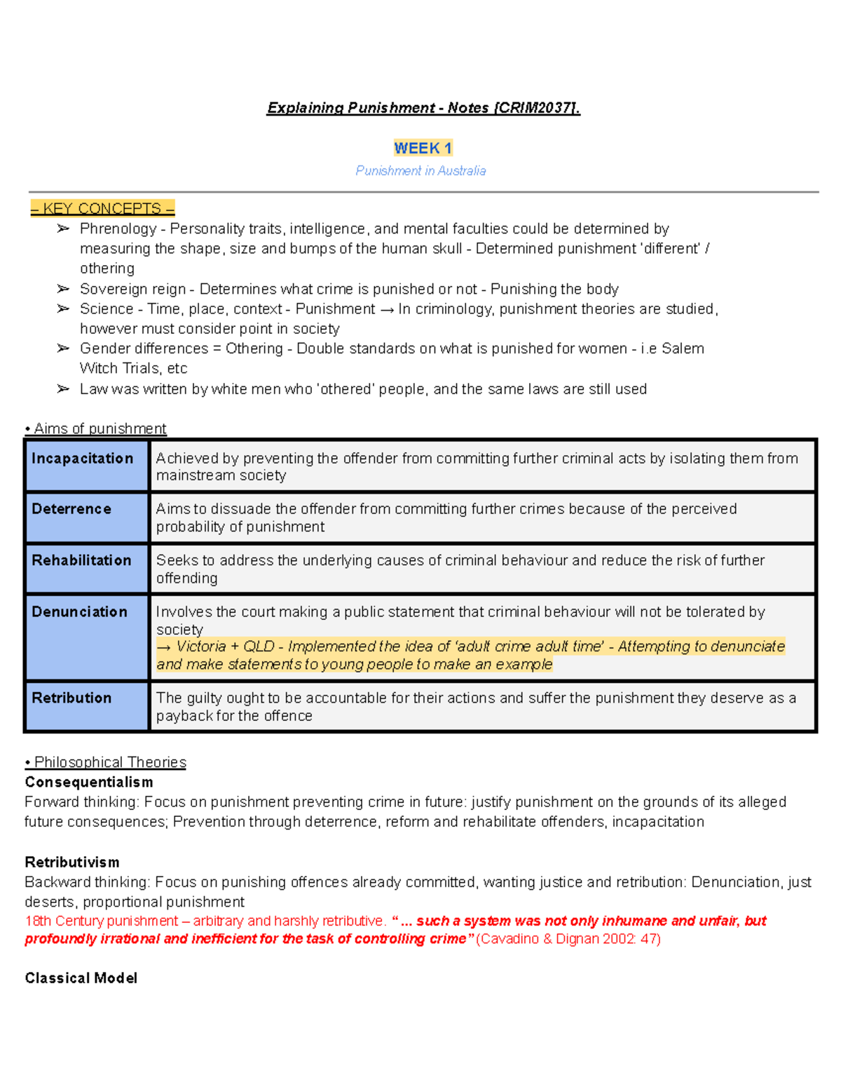CRIM2037 - Week 1 Notes on Punishment Theories in Australia - Studocu