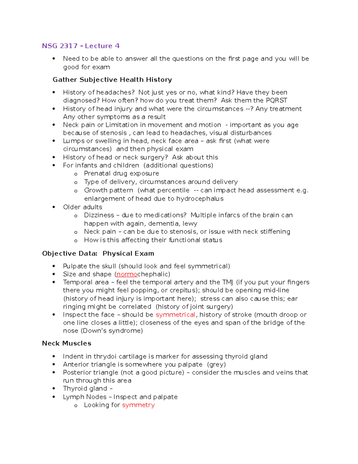 NSG 2317 Lecture 4 - Subjective Health History & Physical Exam Notes ...