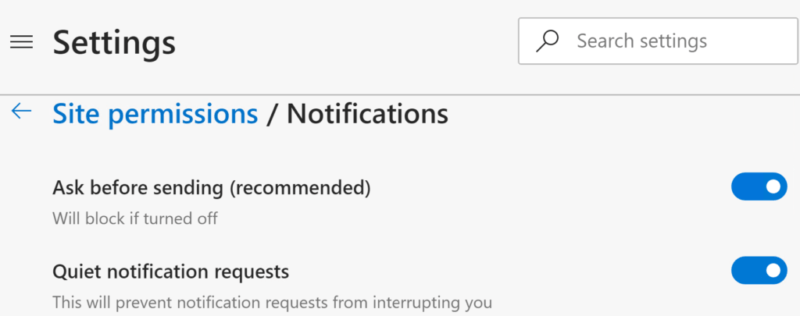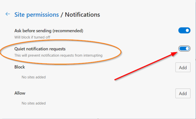Enable Quiet Notification Requests in Microsoft Edge browser