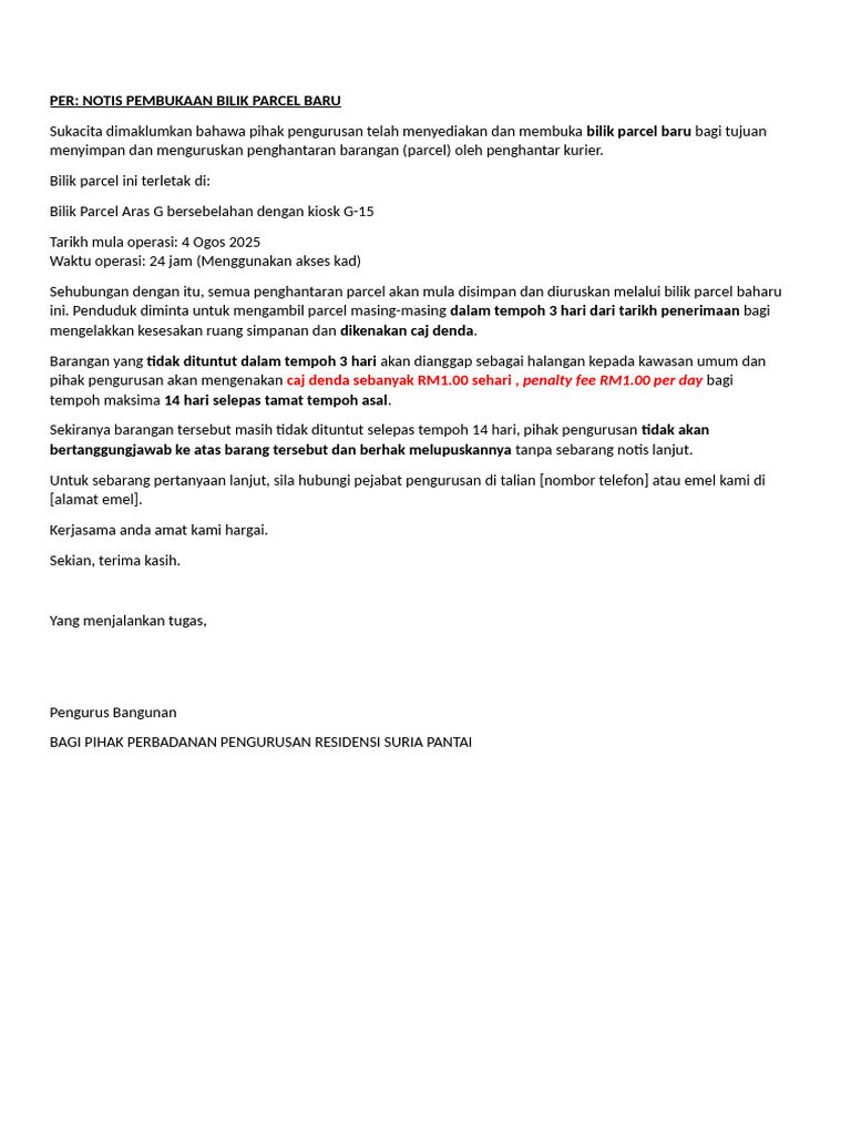 Notis Parcel Room Baharu RSP | PDF
