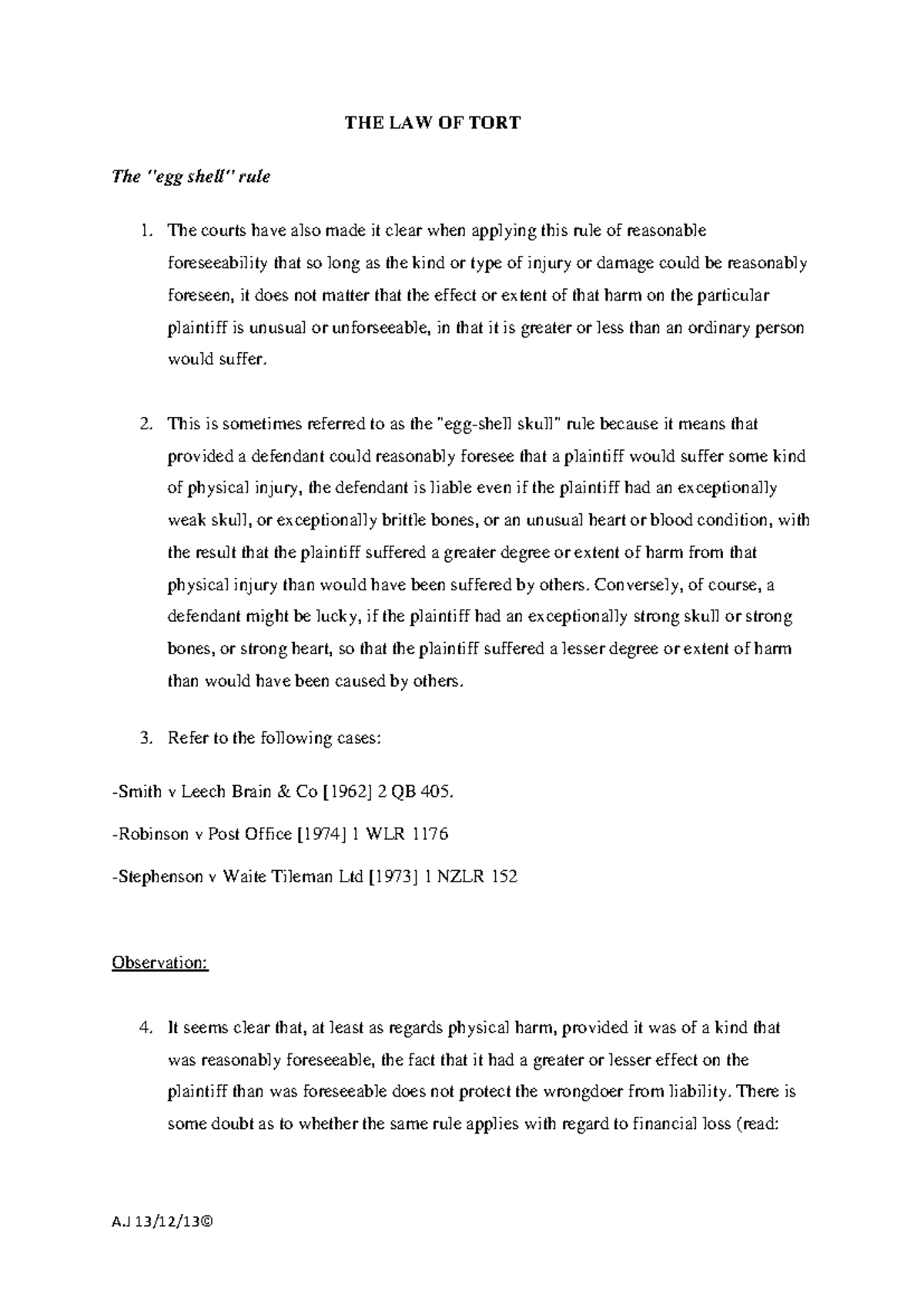 Tort Law: Egg Shell Rule & Novus Actus Interveniens - Lecture Notes ...