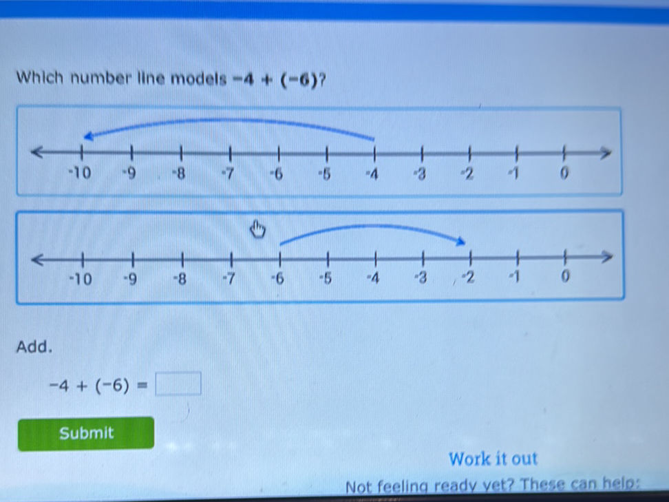 Which number line models -4 + (-6)? Add. -4 | StudyX
