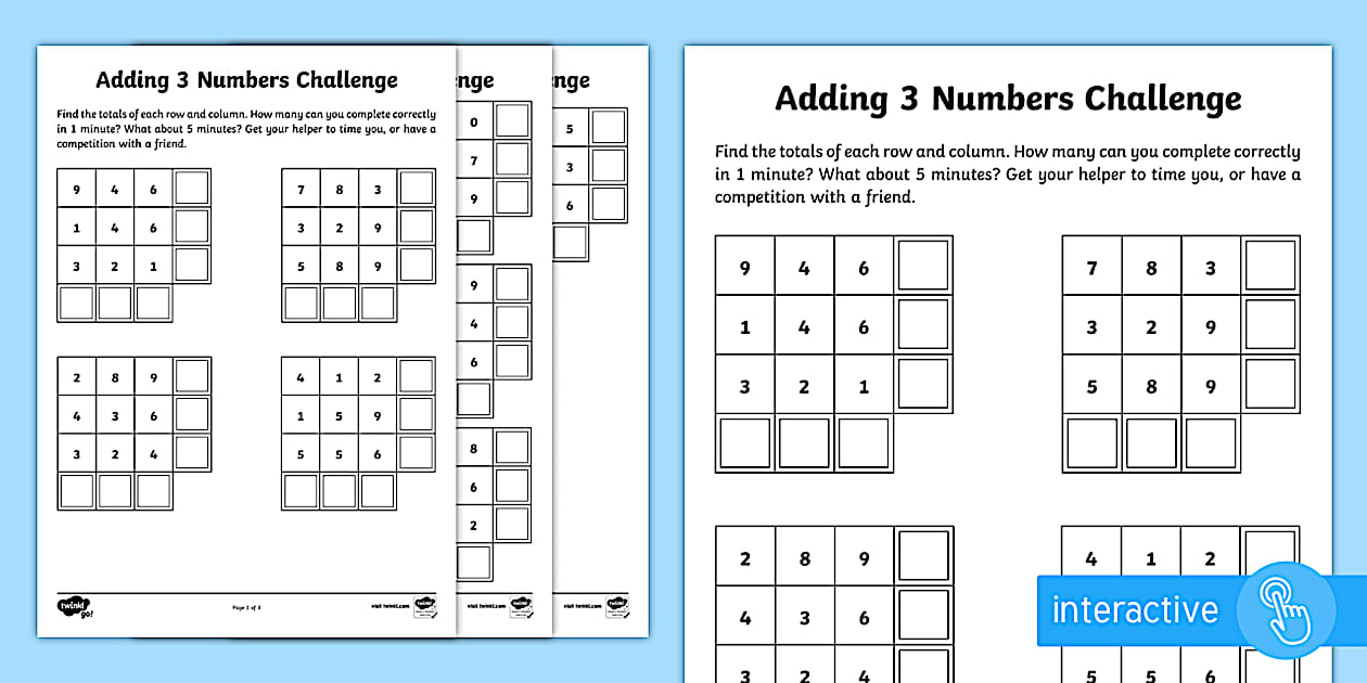 Editable Adding 3 Numbers Homework Challenge Worksheet