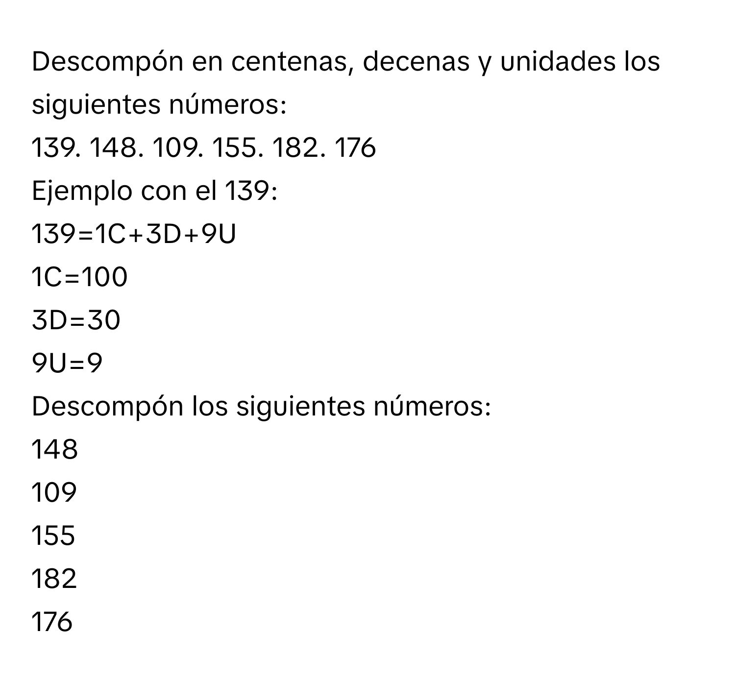 Solved: Descompón en centenas, decenas y unidades los siguientes ...