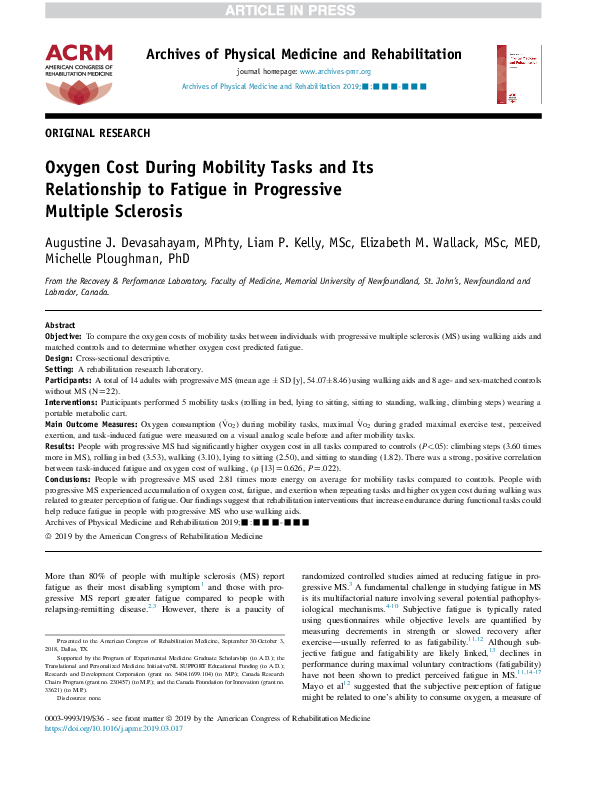 (PDF) Oxygen Cost During Mobility Tasks and Its Relationship to Fatigue ...