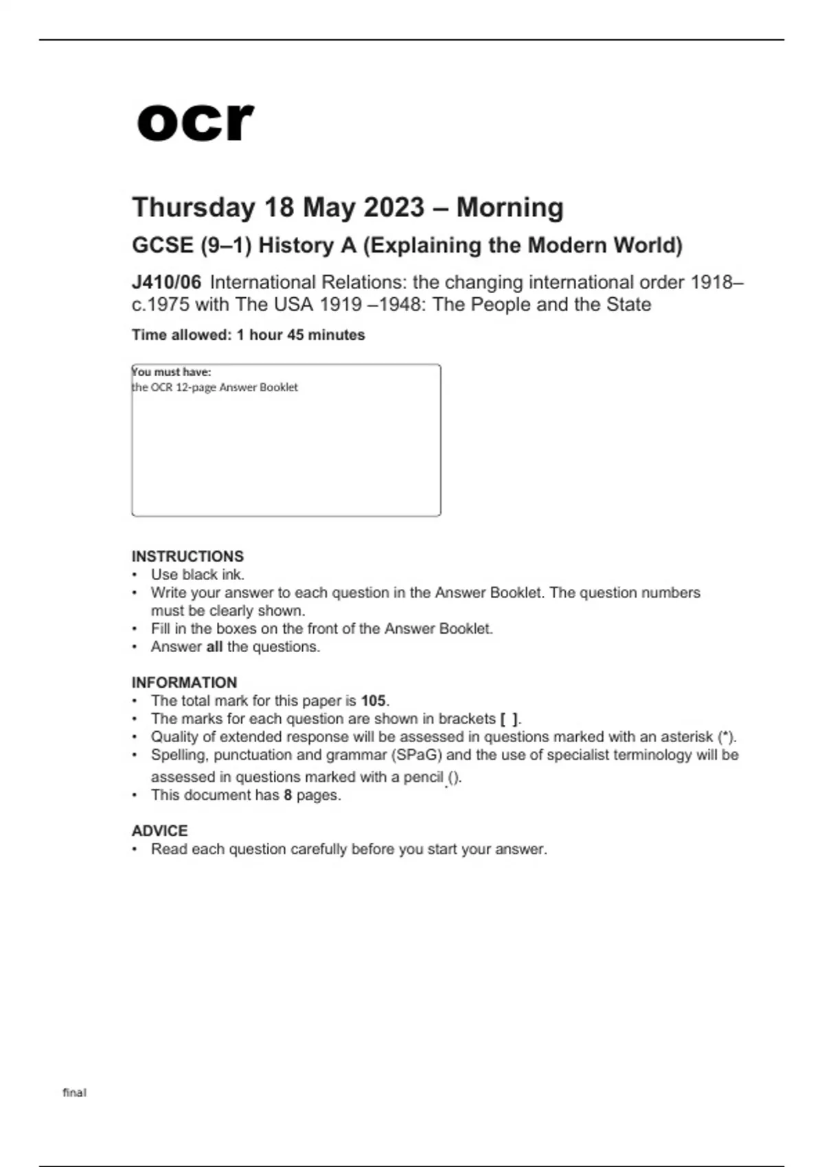 ocr GCSE History A (Explaining the Modern World) J410/06 June2023 ...