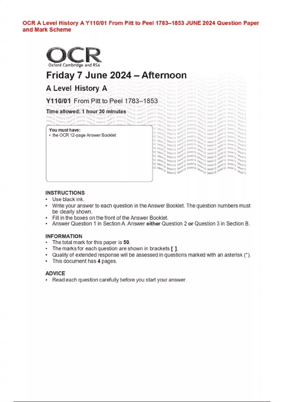 OCR A Level History A Y110/01 From Pitt to Peel 1783–1853 JUNE 2024 ...