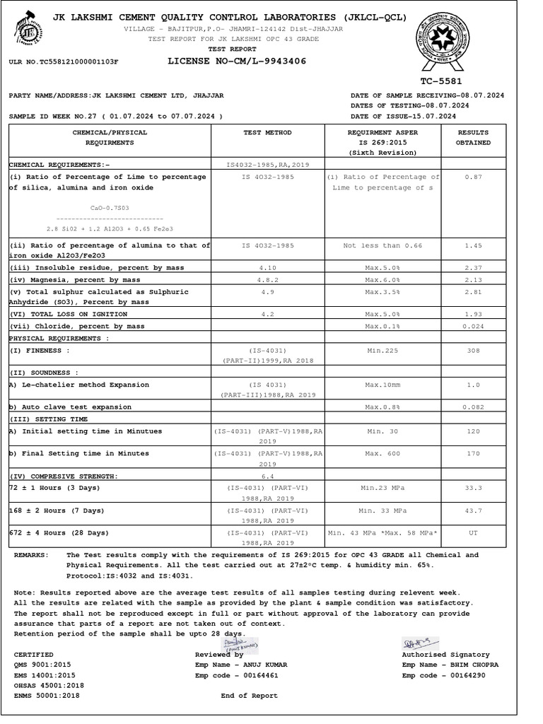 MTC Week 27 - OPC-43 | PDF | Aluminium Oxide | Chemical Compounds