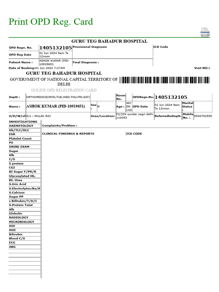 Online OPD Registration Card - GTB Hospital | PDF | Clinical Medicine ...