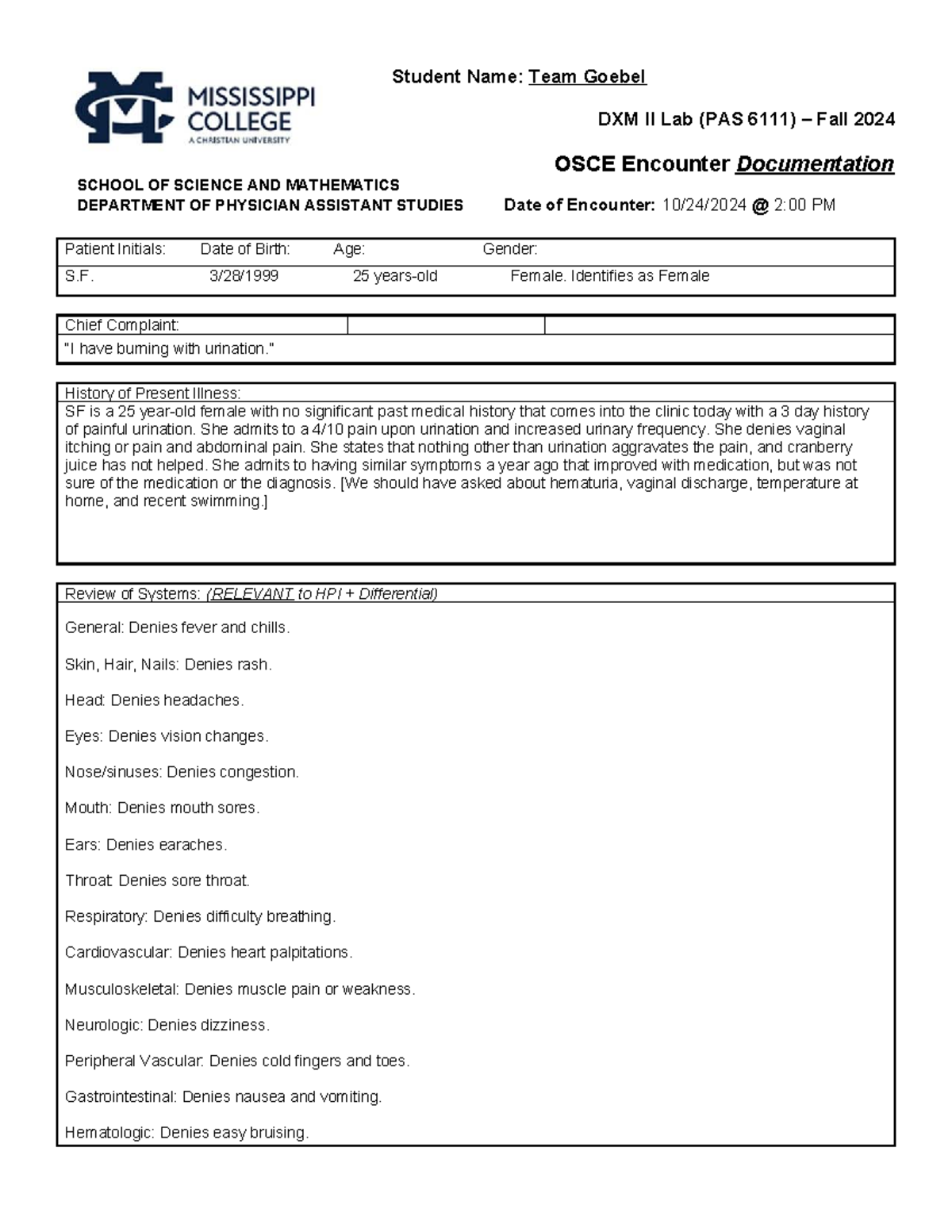 OSCE Encounter Documentation: Patient S.F. - DXM II Lab (PAS Fall 2024 ...
