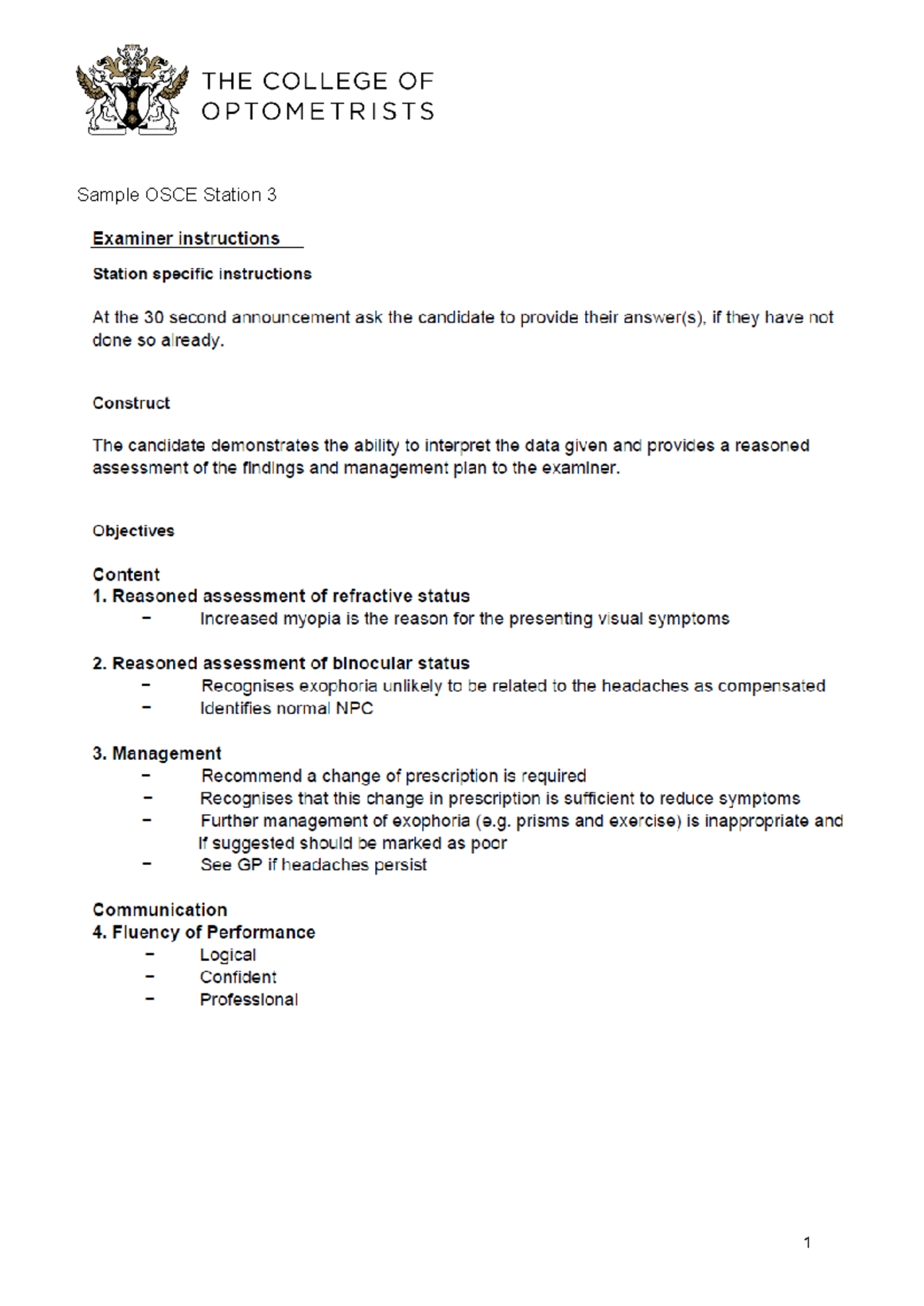Sample OSCE Station 3 - Examiner Instructions for Optometry Assessment ...