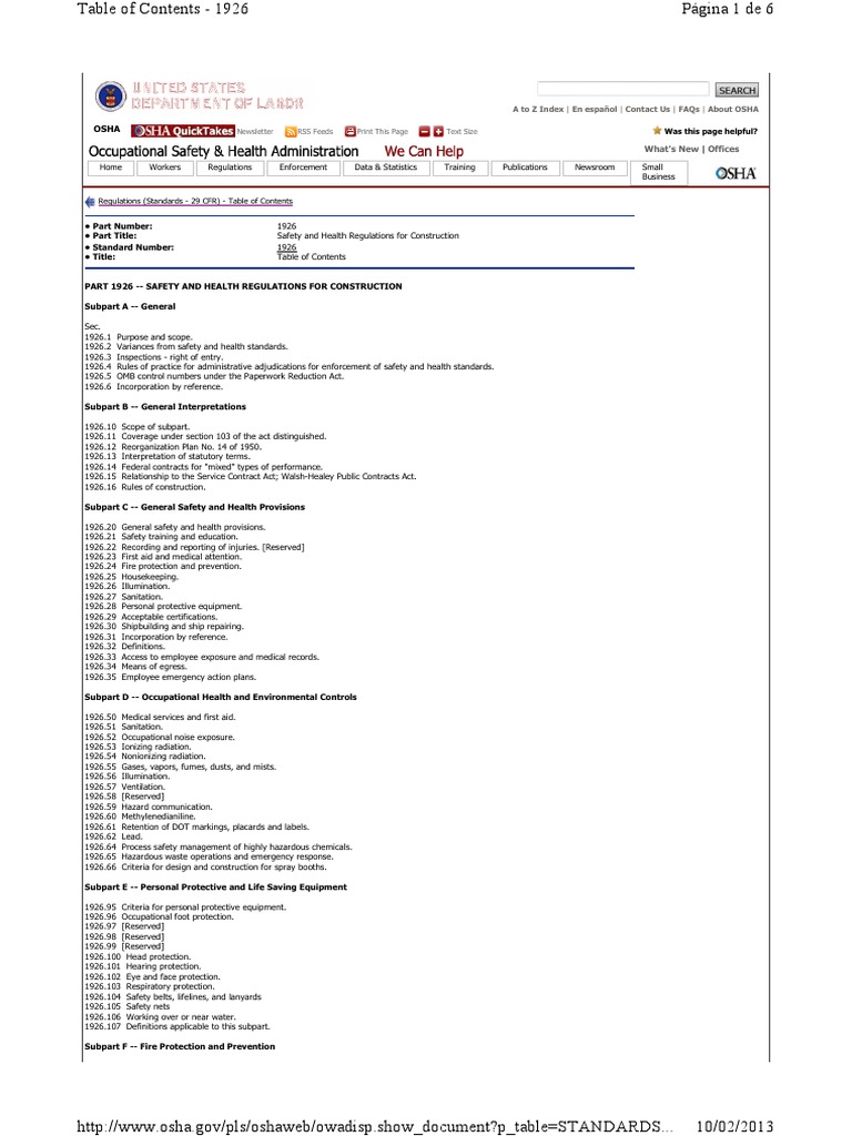 OSHA Construction Safety Regulations Table of Contents | PDF ...