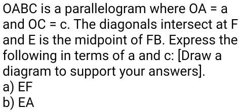 SOLVED: OABC is a parallelogram where OA = a and OC c. The diagonals ...