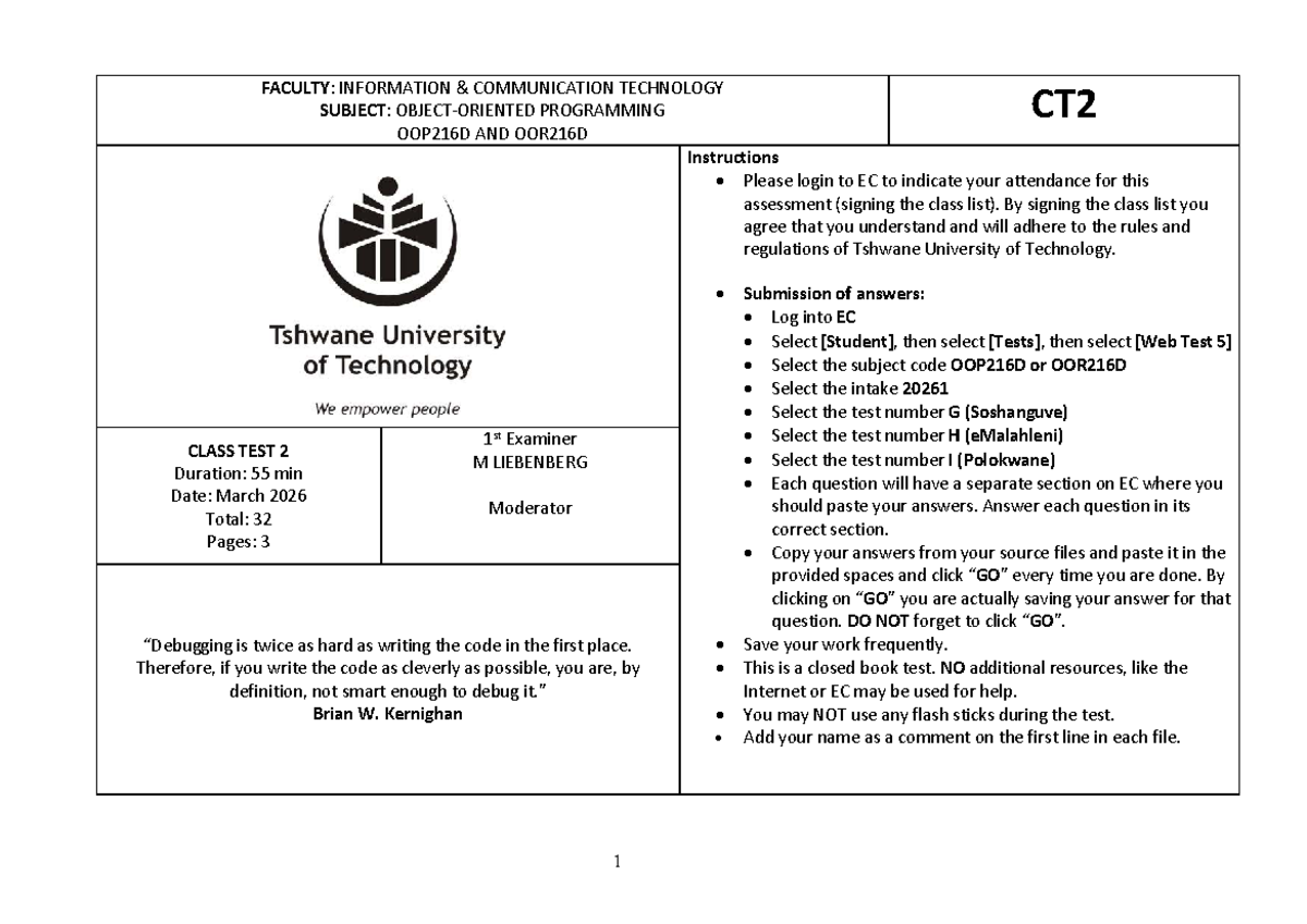 CT2 Class Test: Programming OOP216D & OOR216D Guidelines - Studocu