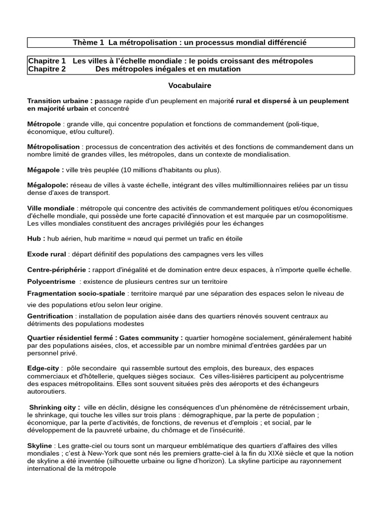 Vocabulaire + Fiche Objectis Métropolisation | PDF