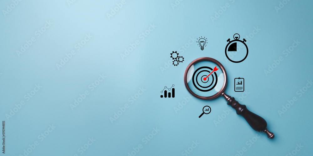 Target board inside vintage magnifying glass for focus business ...