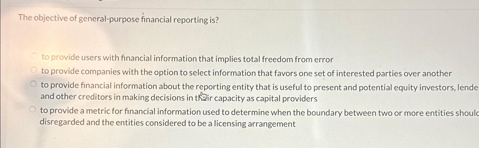 Solved The objective of general-purpose financial reporting | Chegg.com