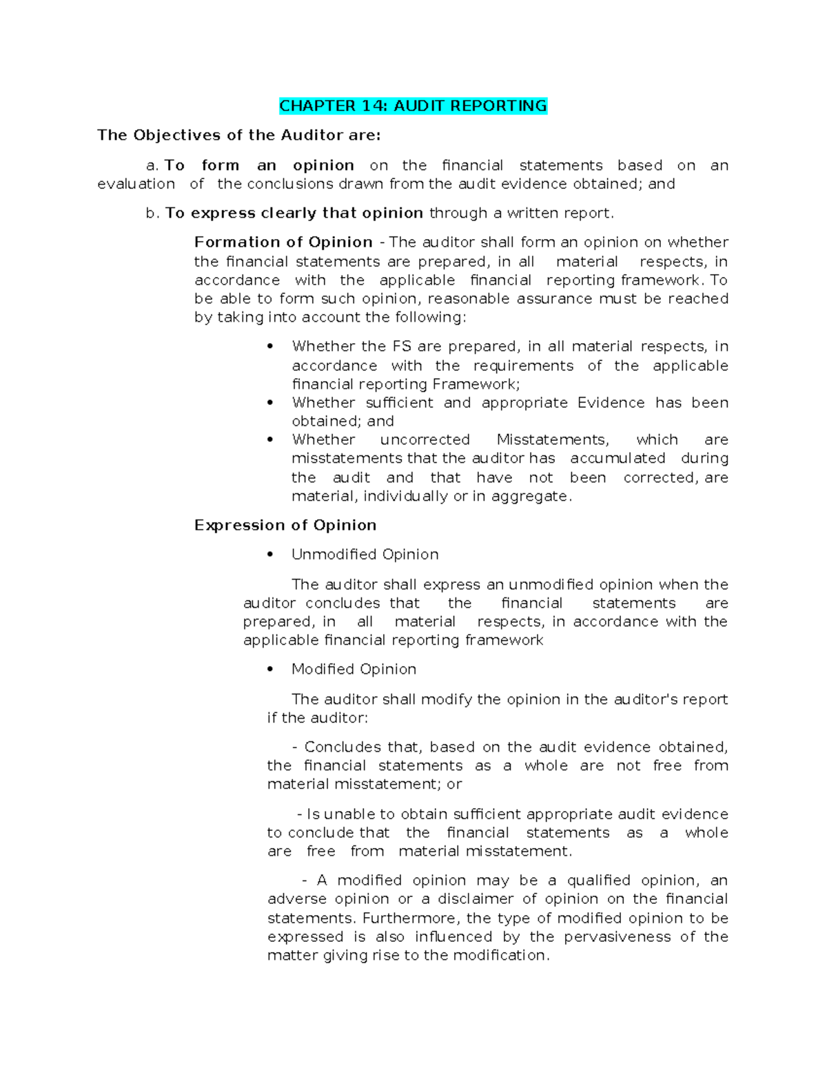 CHAPTER 14: AUDIT REPORTING - Objectives and Opinion Formation - Studocu