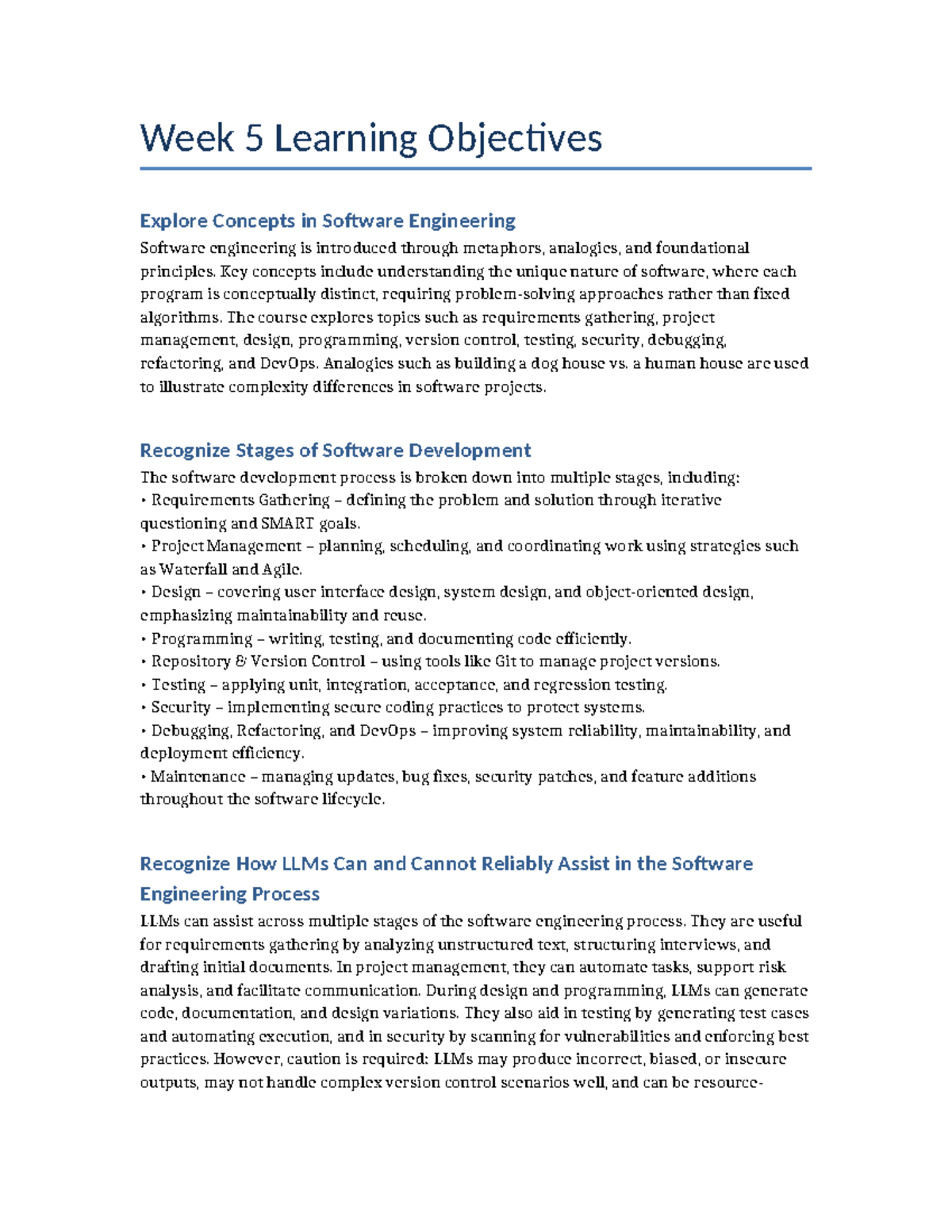 Week 5 Learning Objectives: Software Engineering Concepts & LLMs - Studocu