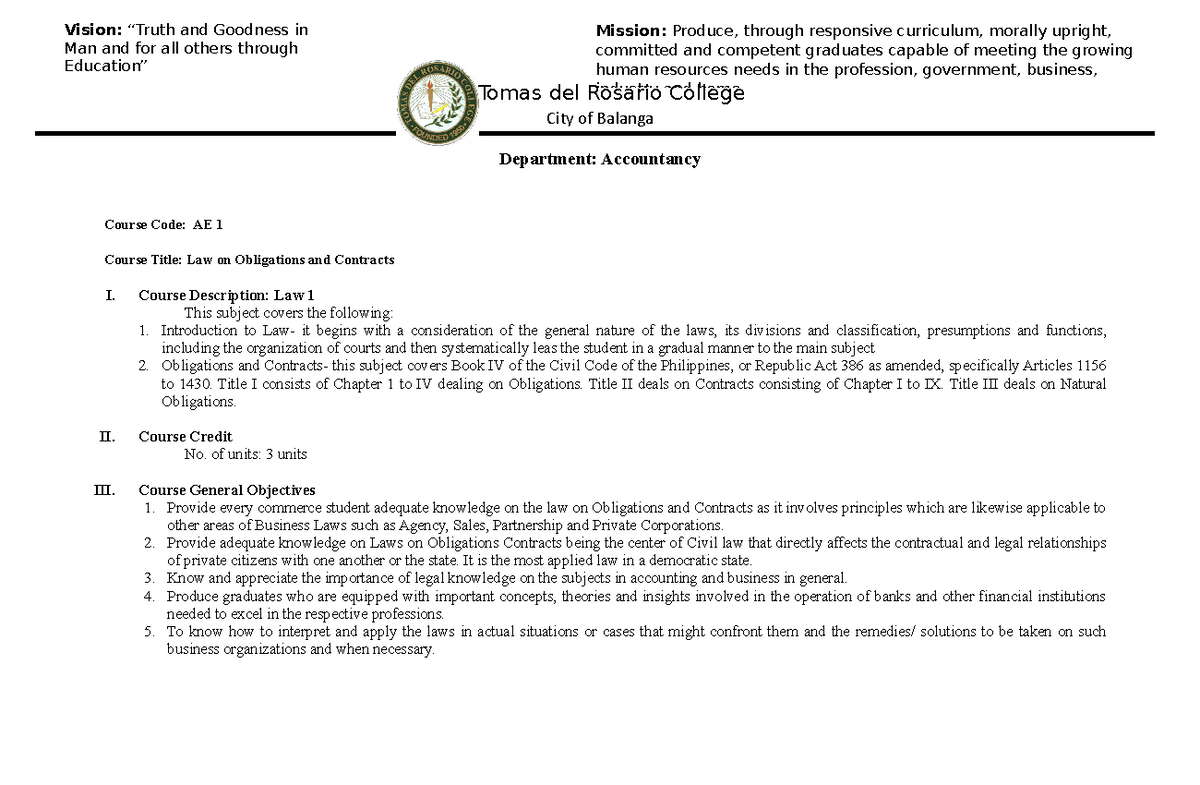 Law on Obligations and Contracts - Course Description: Law 1 This ...