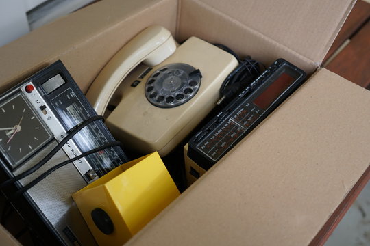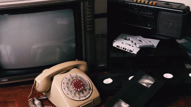 Old Telephone And Obsolet Electronic Equipment On Wooden Floor Stock ...