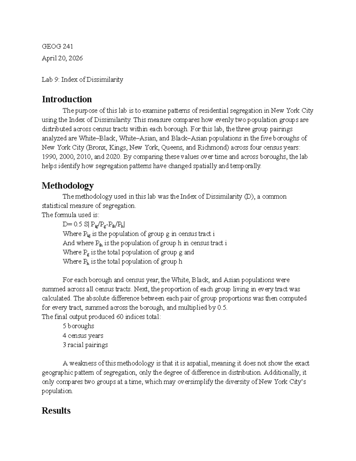 GEOG 241 Lab 9: Analyzing NYC Residential Segregation Patterns - Studocu