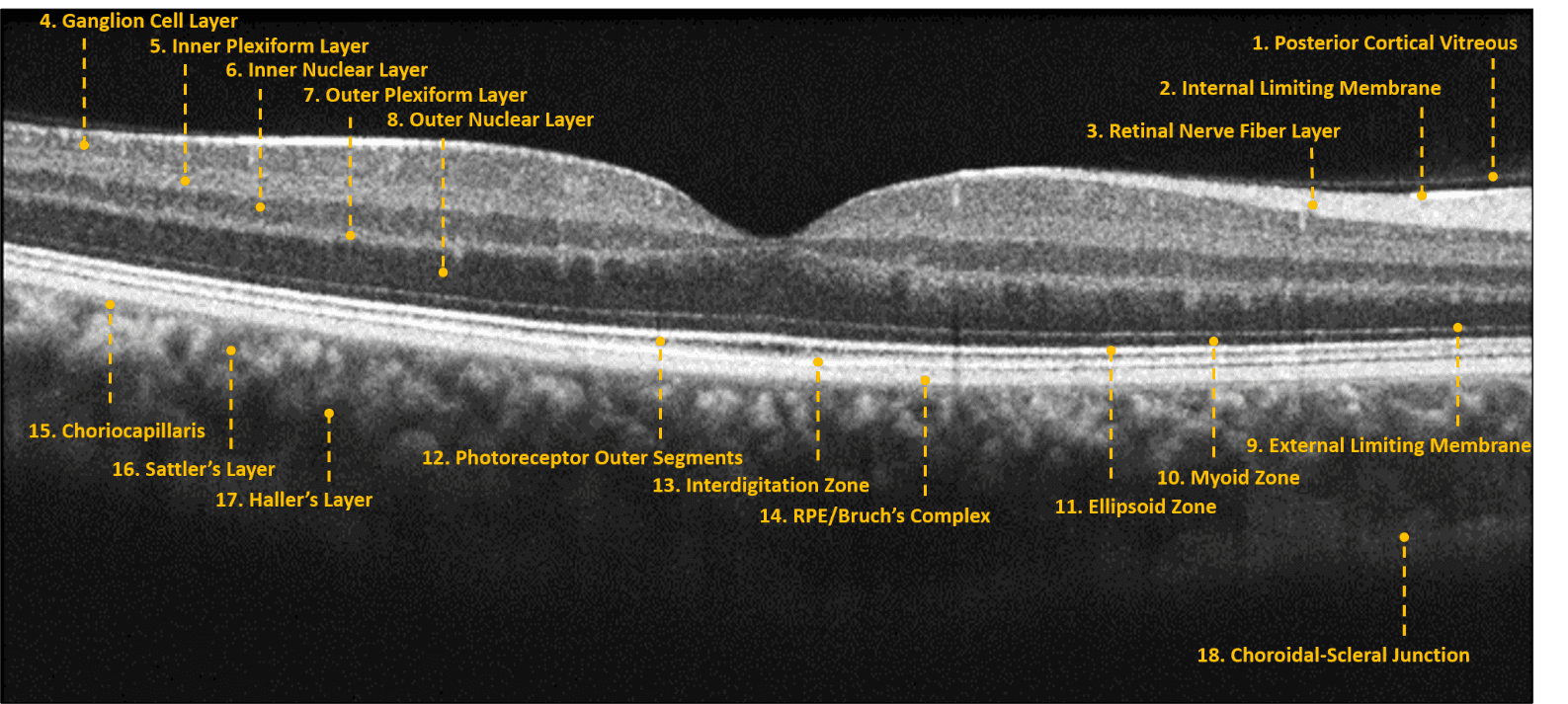Sample OCT B-scan depicting various posterior segment layers (left) and ...