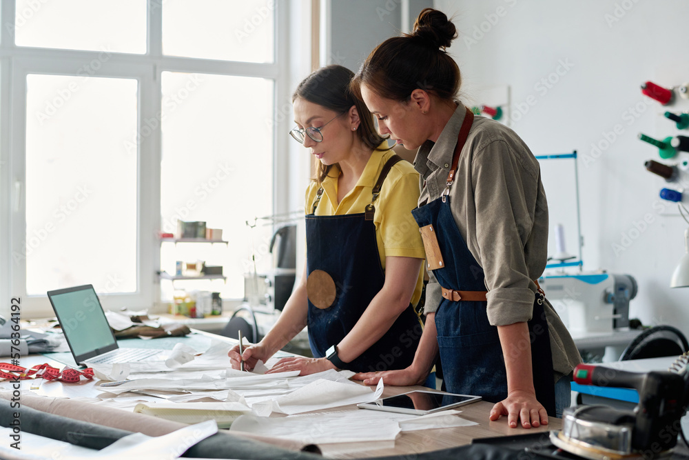 Experienced female tailor putting numbers on sewing paper patterns in ...