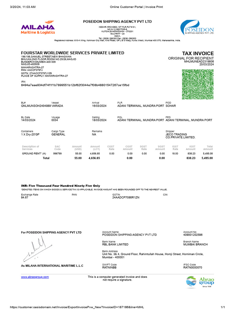 Poseidon Shipping Agency Invoice Details | PDF