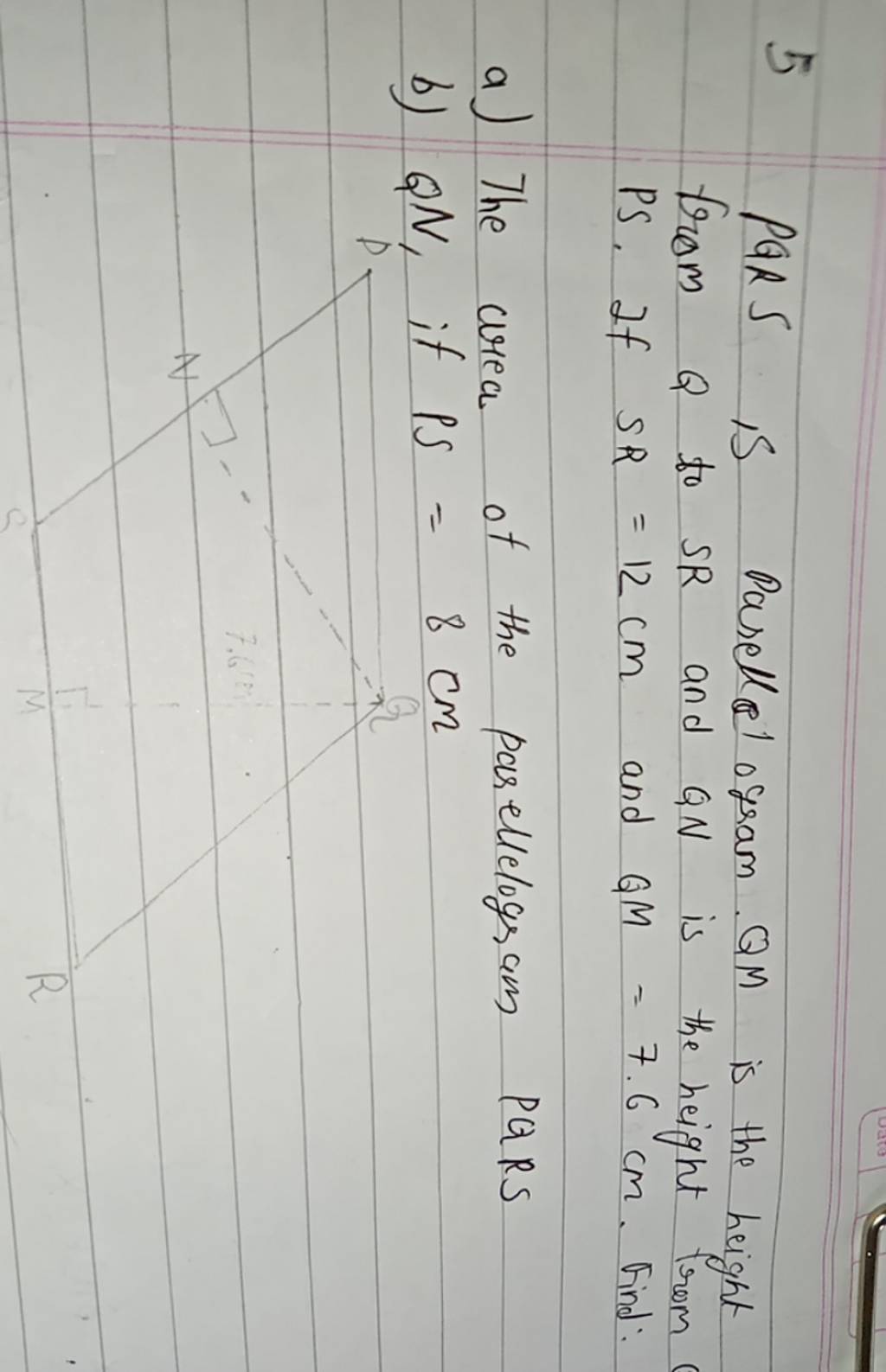 5 PGRS is Parelle ogram. QM is the height from Q to SR and QN is the heig..