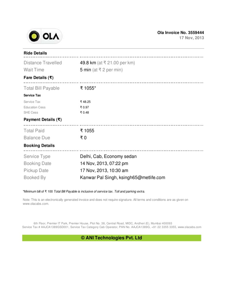 Ola Cab Invoice Template | PDF | Invoice | Payments