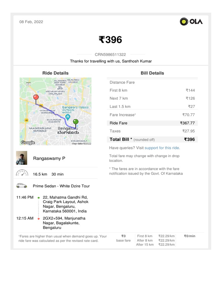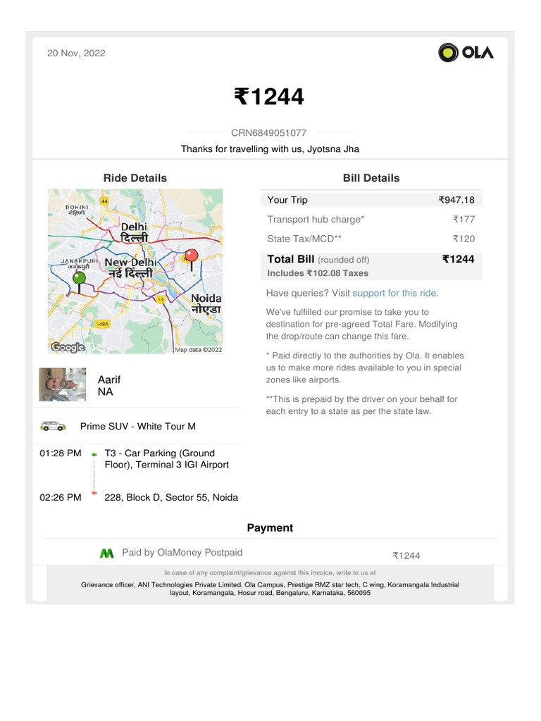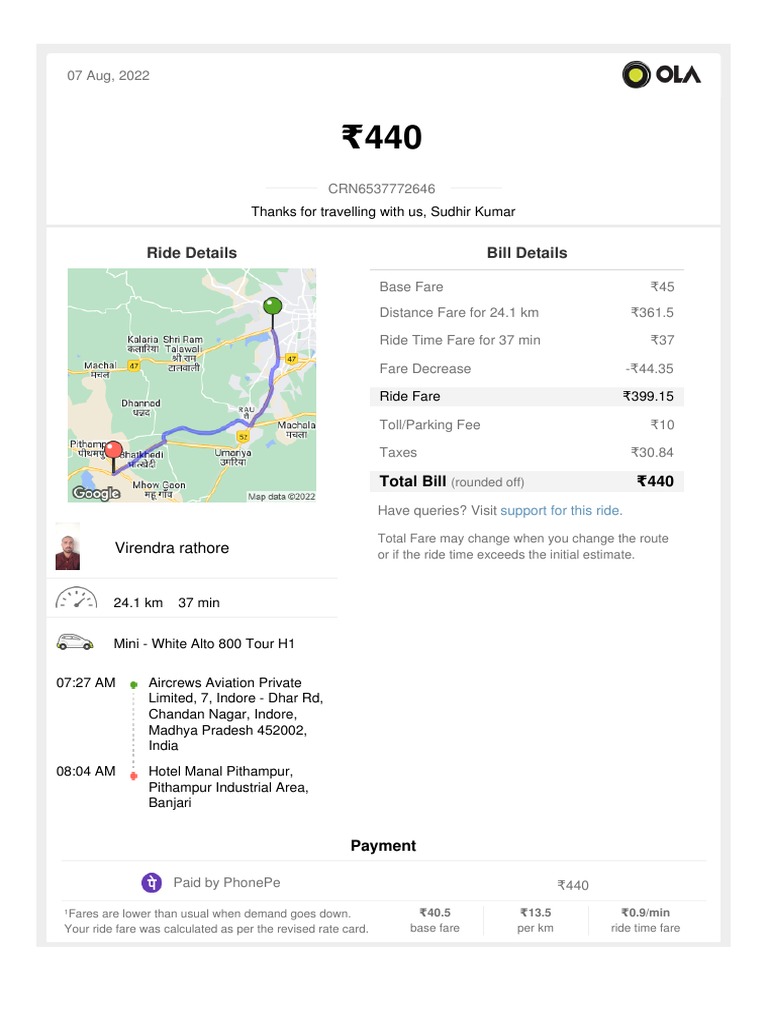 Your Monday Ride With - Ola - : Ride Details Bill Details | PDF ...