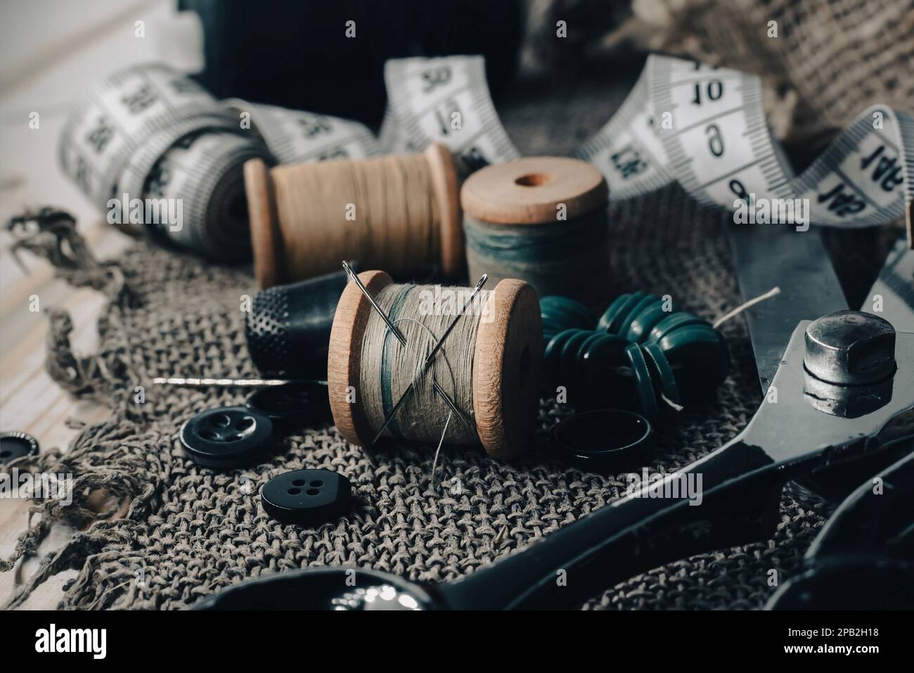 Old threads and needles in sewing workshop Stock Photo - Alamy