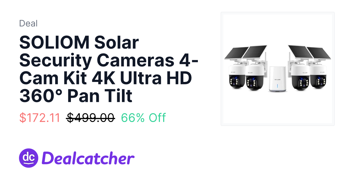 SOLIOM Solar Security Cameras 4-Cam Kit 4K Ultra HD 360° Pan Tilt - $172.11