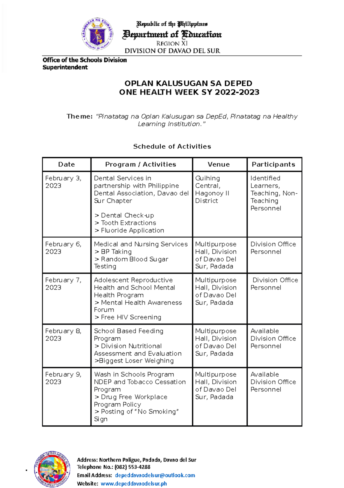 DEPED SCHEDULED/SUGGESTED ACTIVITIES DURING THE ONE HEALTH WEEK ...