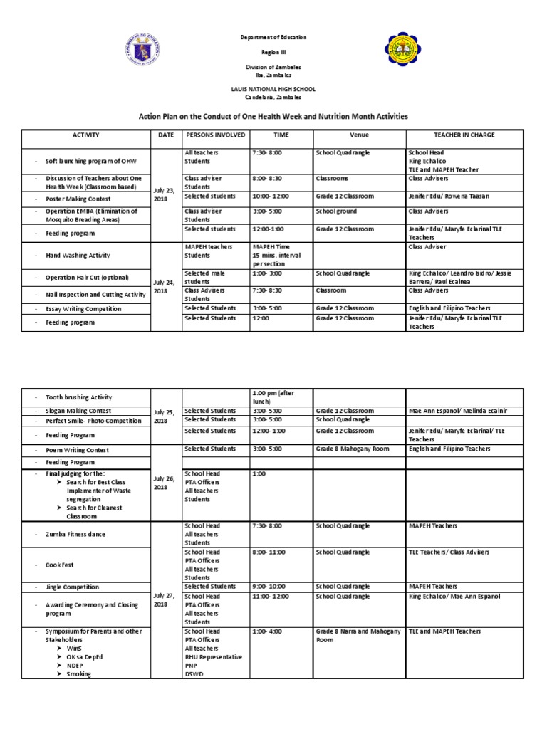 One Health Week & Nutrition Month Plan | PDF | Behavior Modification