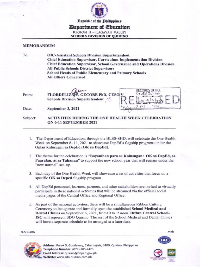 DM No. 397, s. 2022 - OK sa DepEd One Health Week 2022 | PDF