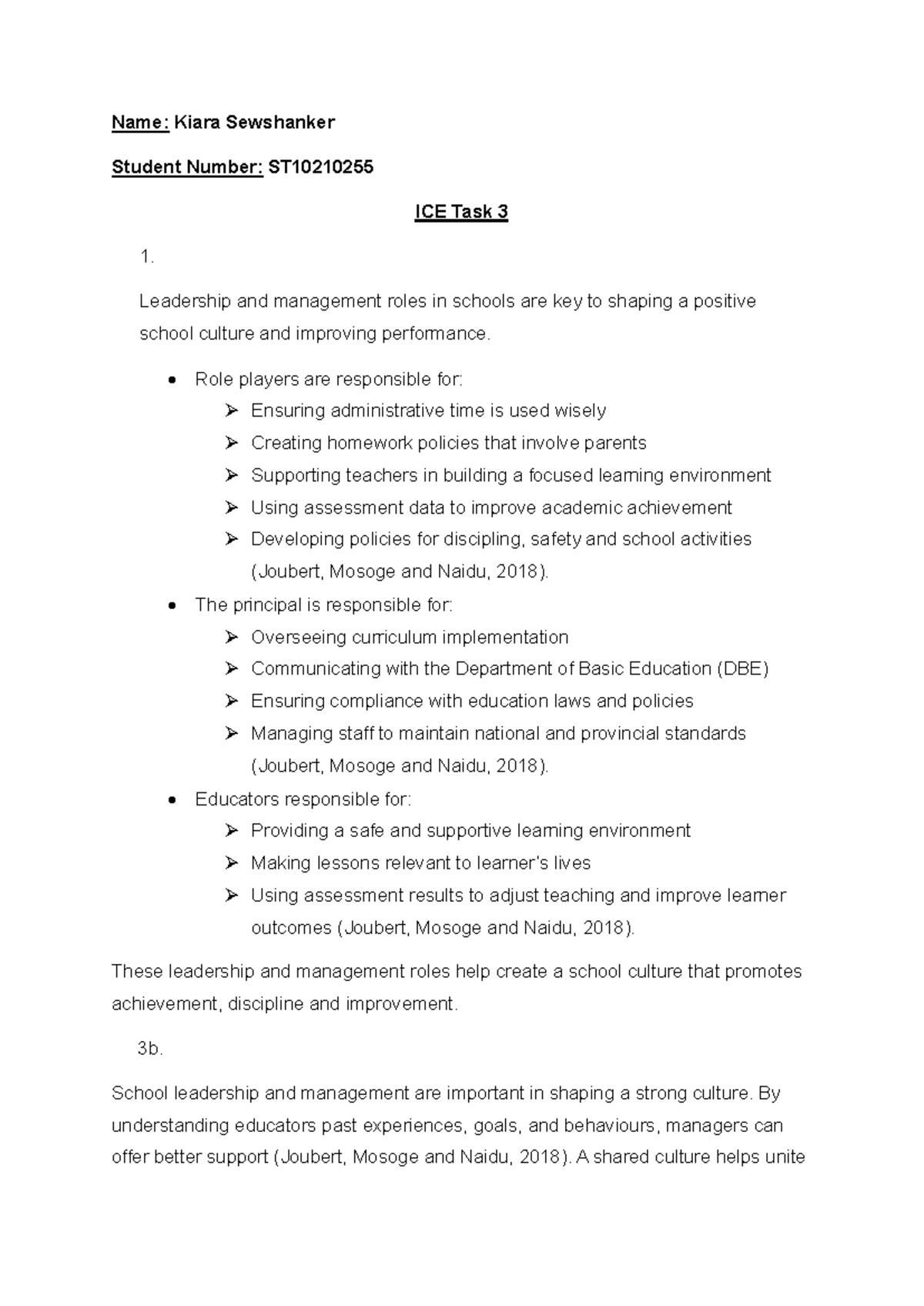 ICE Task 3 - Leadership and Management Roles in Schools - Studocu