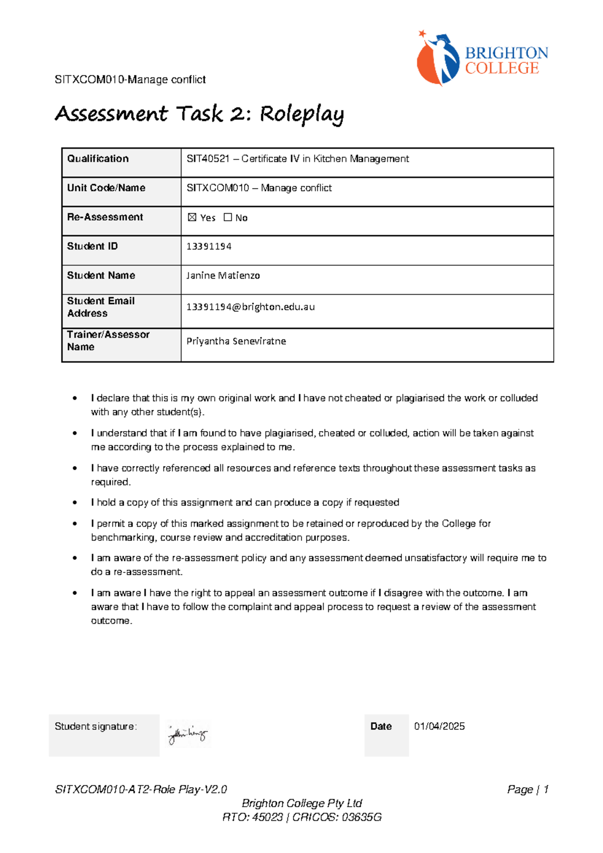 SITXCOM010 Conflict Assessment Task 2: Roleplay Guide for SIT40521 ...