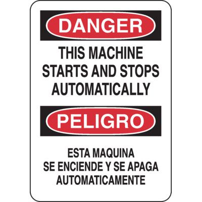 Machine Safety Signs - Bilingual - This Machine Starts and Stops ...