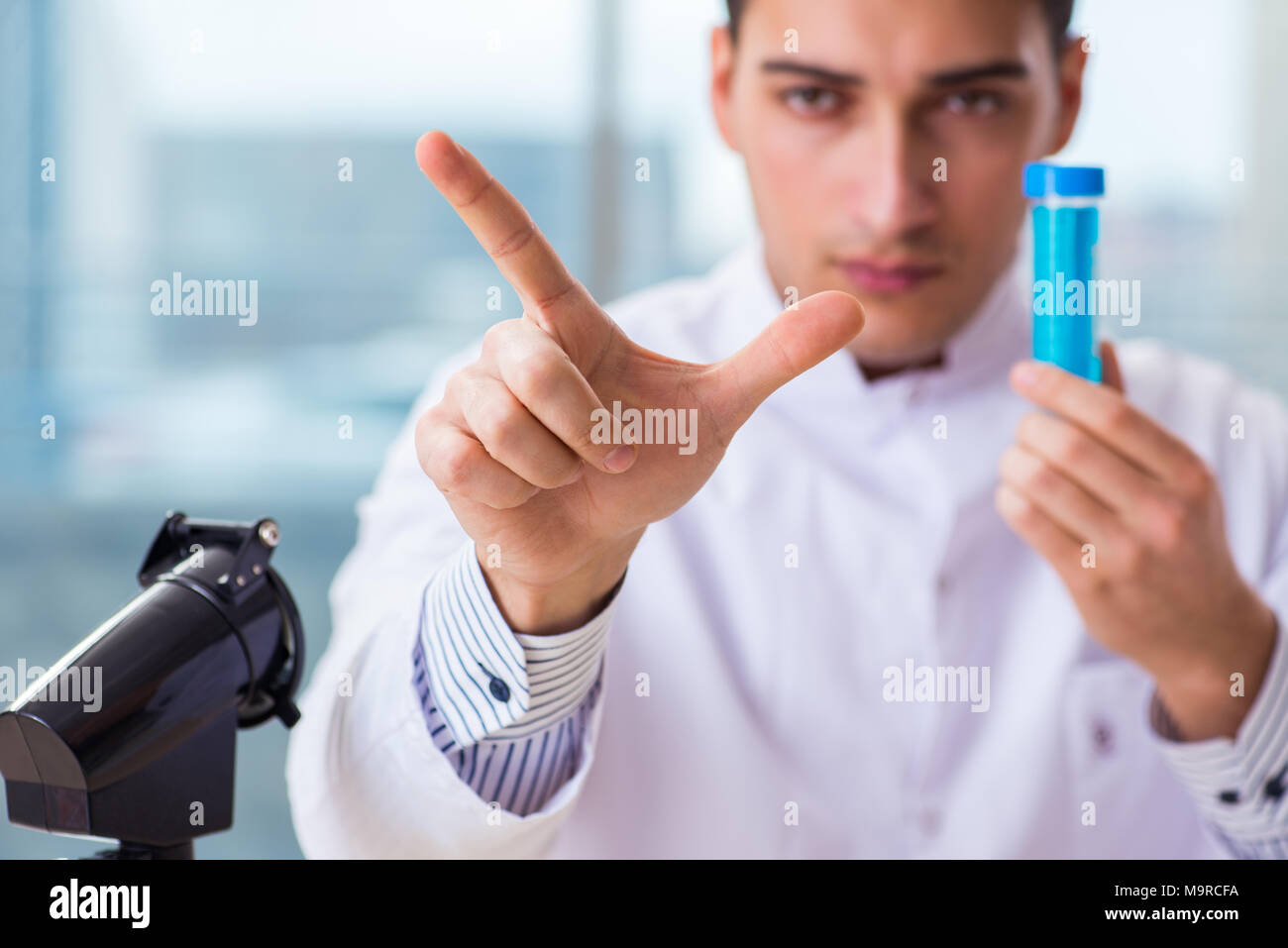 Young chemist pressing virtual buttons in lab Stock Photo - Alamy