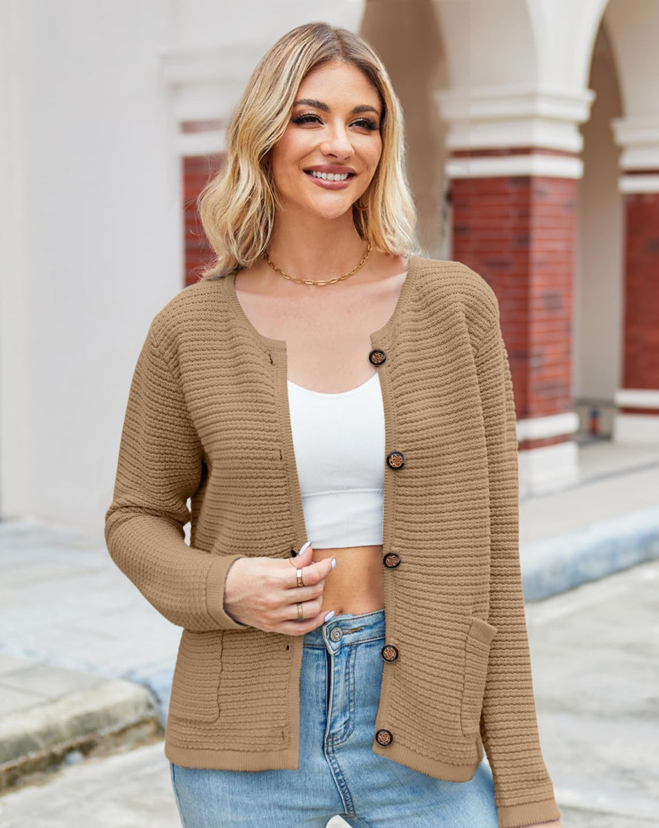 Women's Cardigan Sweater Knitted Ribbed Button Front Round Neck Long ...