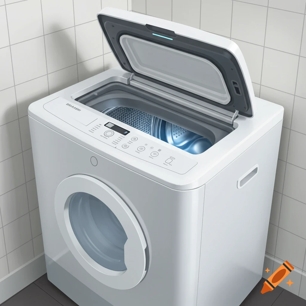 A white modern top-opening washing machine with the lid raised. on Craiyon