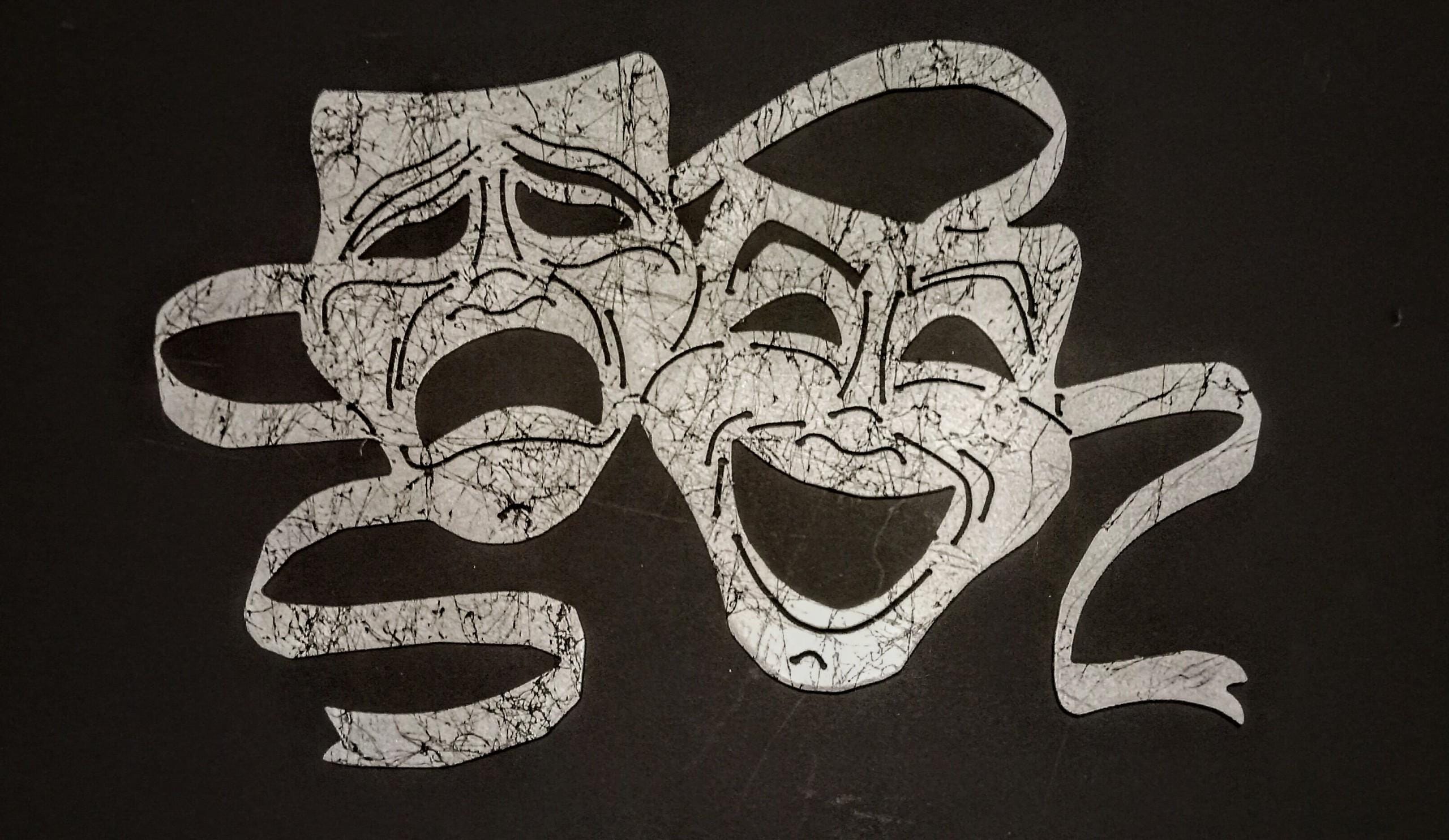 Painting of tragedy and comedy theater masks with text "Cry now laugh ...