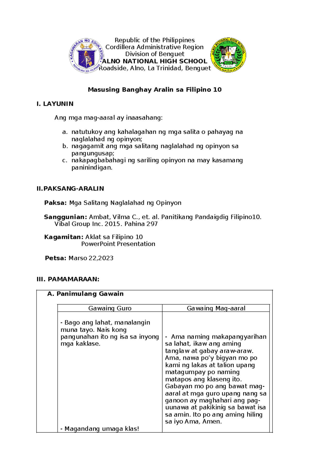 Mga Salitang Naglalahad ng Opinyon sa Filipino 10: Banghay Aralin - Studocu