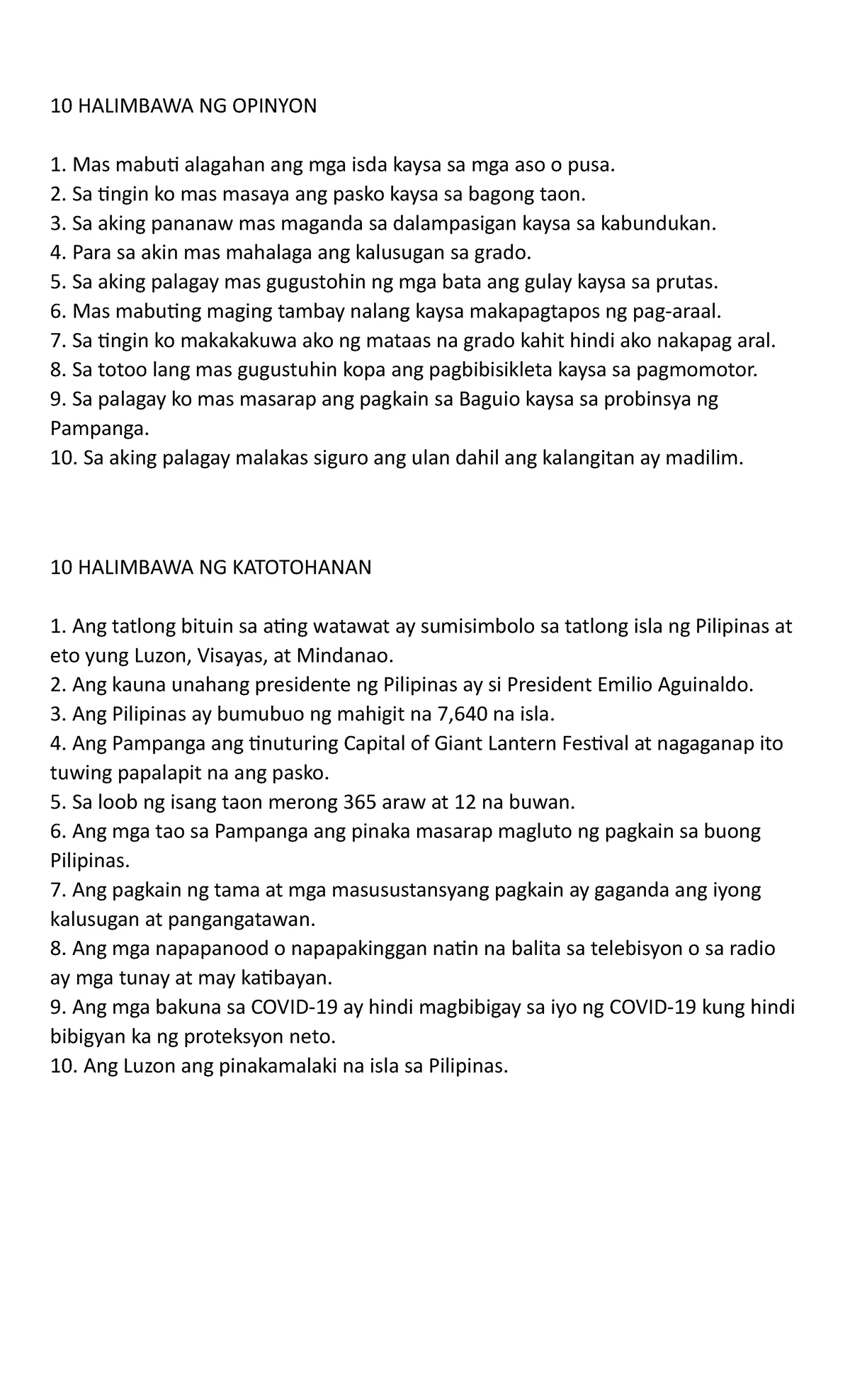 magbigay ng 5 halimbawa ng opinyon at 10 na halimbawa sa katotohanan ...