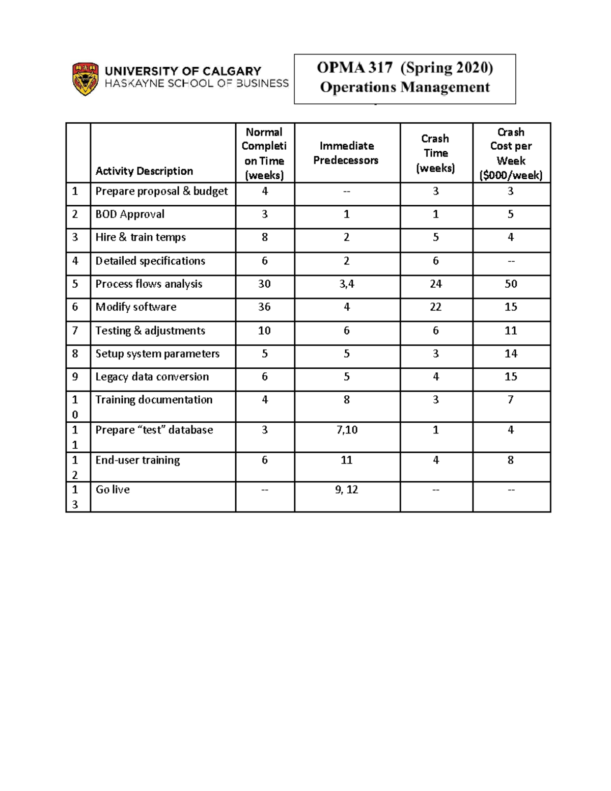 OPMA 317 Assignment 1 - 1. Activity Table Activity Description Normal ...