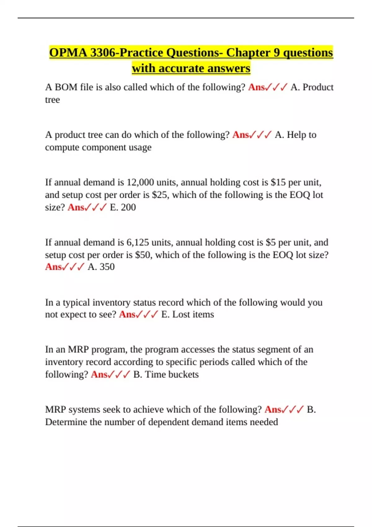 OPMA 3306 quiz 1 with complete solutions graded A+ updated already ...